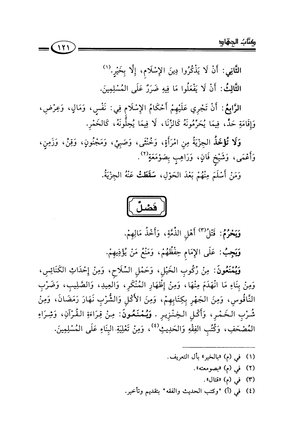 الرابع: أن تجري عليهم أحكام الإسلام في نفس ومال وعرض وإقامة حد فيما يحرمونه كالزنا لا فيما يحلونه كالخمر.