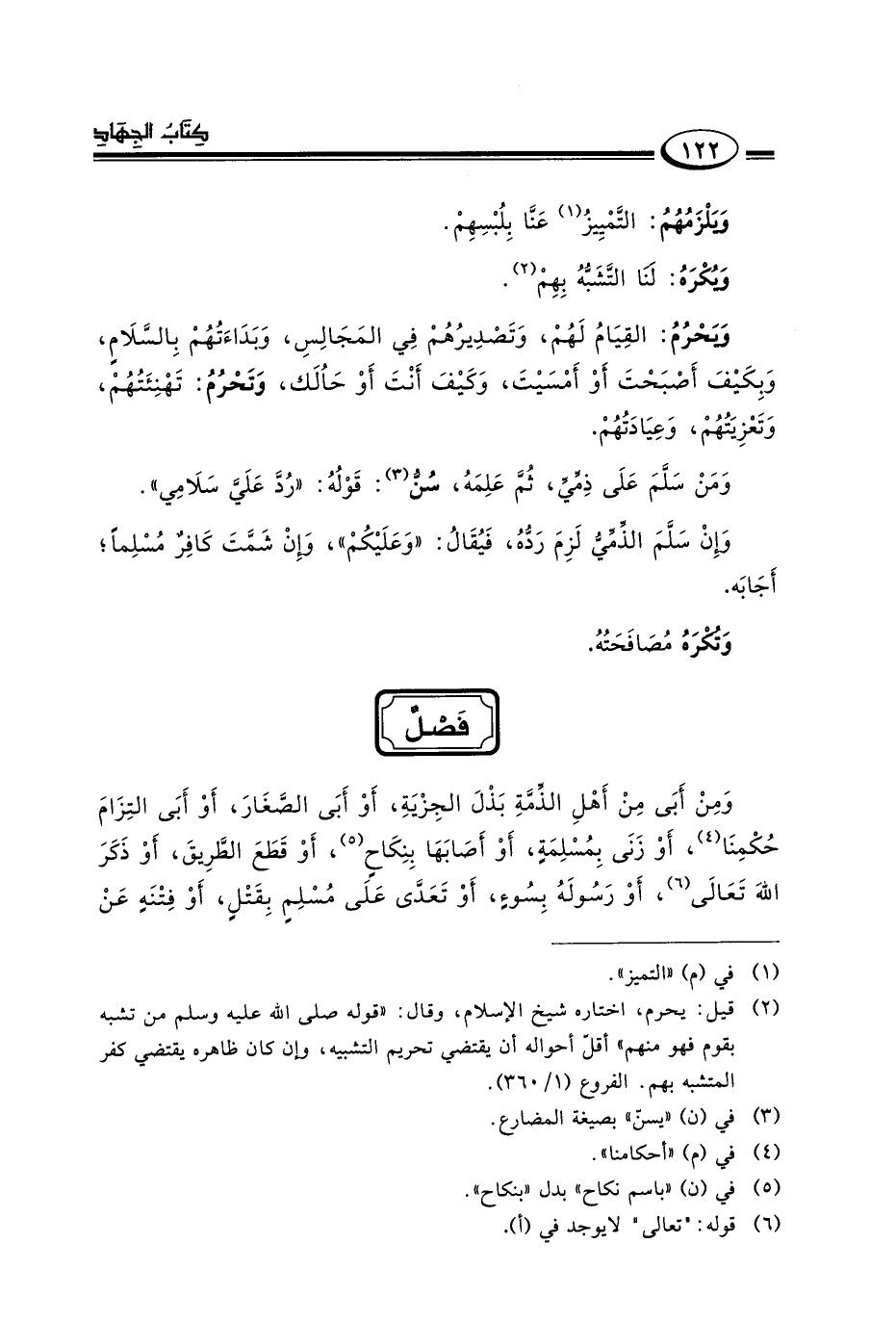 ٢ قيل: يحرم اختار شيخ الإسلام, وقال: "قوله صلى الله عليه وسلم: "من تشبه بقوم فهو منهم" " أقل أحواله أن يقتضي تحريم التشبيه وأن كان ظاهره يقتضي كفر المتشبه بهم. الفروع "١/٣٦٠".