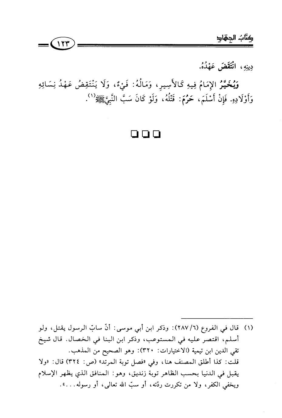 ويخير الإمام فيه كالأسير وماله فيء ولا ينقض عهد نسائه وأولاده فإن أسلم حرم قتله ولو كان سب النبي صلى الله عليه وسلم١.