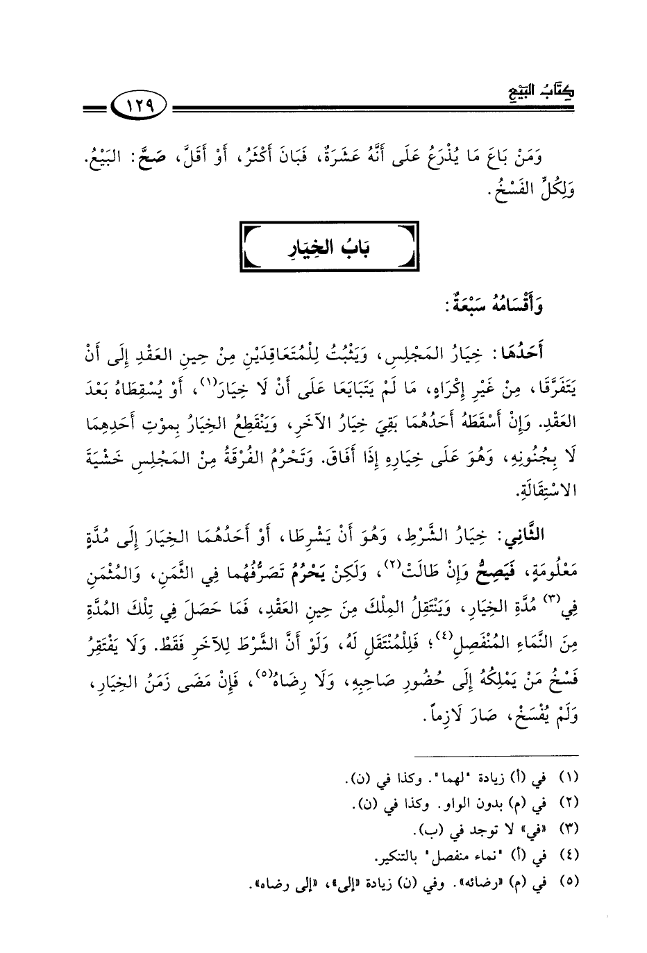 أحدها: خيار المجلس ويثبت للمتعاقدين من حين العقد إلى أن يتفرقا من غير إكراه ما لم يتبايعا على أن لا خيار أو يسقطاه بعد العقد وان أسقطه أحدهما بقي خيار١ الآخر وينقطع الخيار بموت أحدهما لا بجنونه وهو على خياره إذا أفاق وتحرم الفرقة من المجلس خشية الاستقالة.