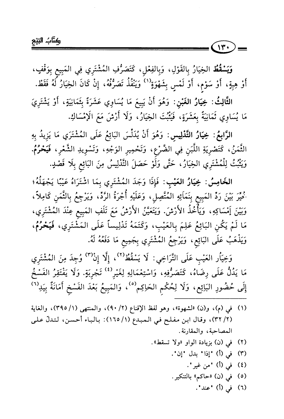 الخامس: خيار العيب فإذا وجد المشتري بما اشتراه عيبا يجهله خير بين رد المبيع بنمائه المتصل وعليه أجرة الرد ويرجع بالثمن كاملا وبين إمساكه ويأخذ الأرش ويتعين الأرش مع تلف المبيع عند المشتري ما لم يكن البائع علم بالعيب وكتمه تدليسا على المشتري فيحرم ويذهب على البائع ويرجع المشتري بجميع ما دفعه له.