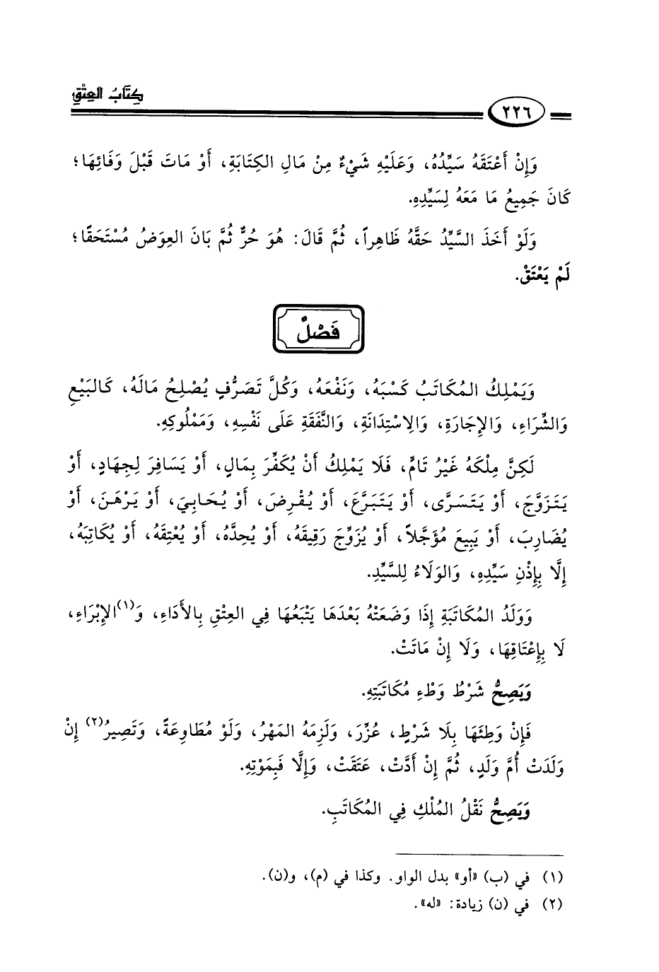 وولد المكاتبة إذا وضعته بعدها يتبعها في العتق بالأداء و١ الإبراء لا بإعتاقها ولا إن ماتت.