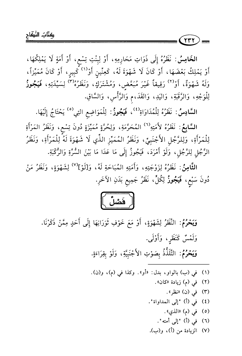 الخامس: نظره إلى ذوات محارمه أولبنت تسع أو أمة لا يملكها أو يملك بعضها أو كان لا شهرة له كعنين أو١كبير أو كان مميزا وله شهوة أو٢ رقيقا غير مبعض ومشترك ونظرة٣ لسيدته فيجوز للوجه والرقبة واليد والقدم والرأس والساق.