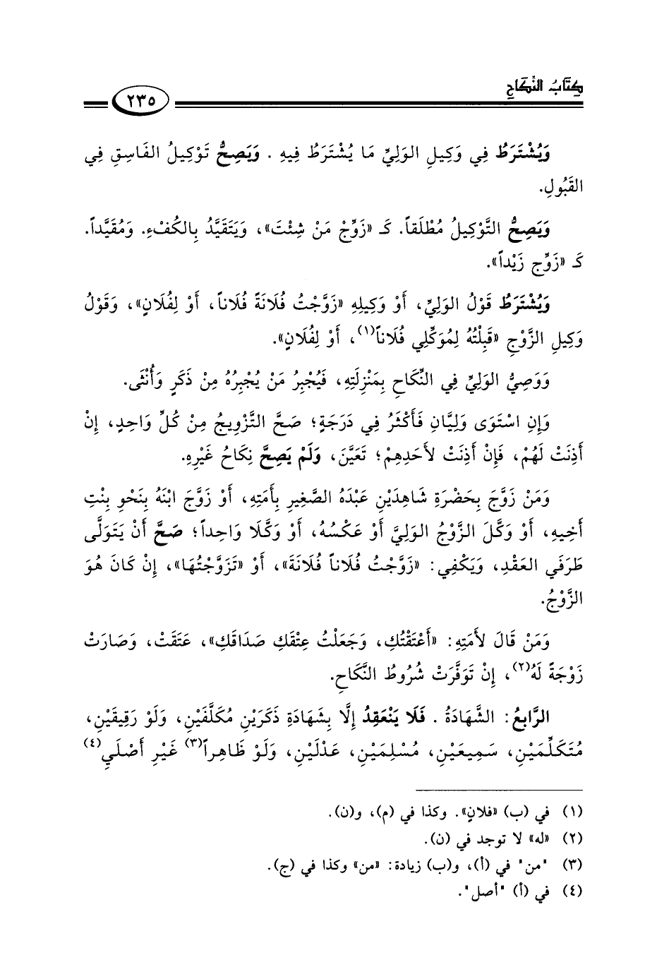 ومن زوج بحضرة شاهدين عبده الصغير بأمته أو زوج ابنه بنحو بنت أخيه أو وكل الزوج الولي أو عكسه أو وكلا واحدا صح أن يتولى طرفي العقد ويكفي: زوجت فلانا فلانة أو: تزوجتها إن كان هو الزوج.