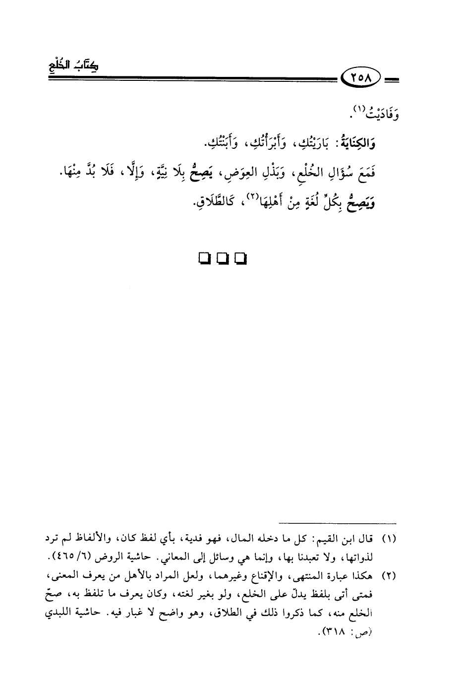 ١ قال ابن القيم: كل ما دخله المال فهو فدية بأي لفظ والألفاظ لم ترد لذوتها ولا تعبدنا بها وإنما هي وسائل إلى المعاني. حاشية: الروض "ص: ٦/٤٦٥".