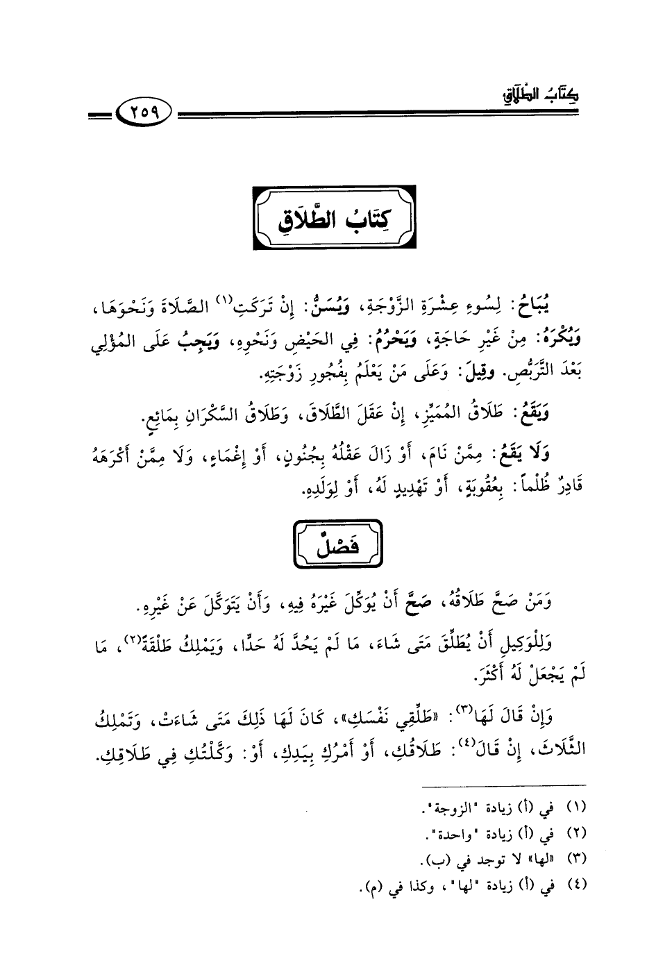 يباح لسوء عشرة الزوجة ويسن إن تركت١ الصلاة ونحوها ويكره من غير حاجة ويحرم في الحيض ونحوه ويجب على المؤلي بعد التربص قيل: وعلى من يعلم بفجور زوجته.
