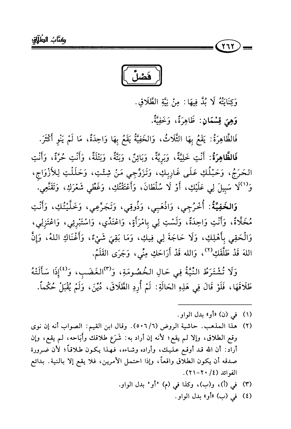فالظاهرة: أنت خلية وبرية وبائن وبتة وبتلة وأنت حرة وأنت الحرج وحبلك على غاربك وتزوجي من شئت وحللت للأزواج و١لا سبيل لي عليك أو لا سلطان وأعتقتك وغطي شعرك وتقنعي.