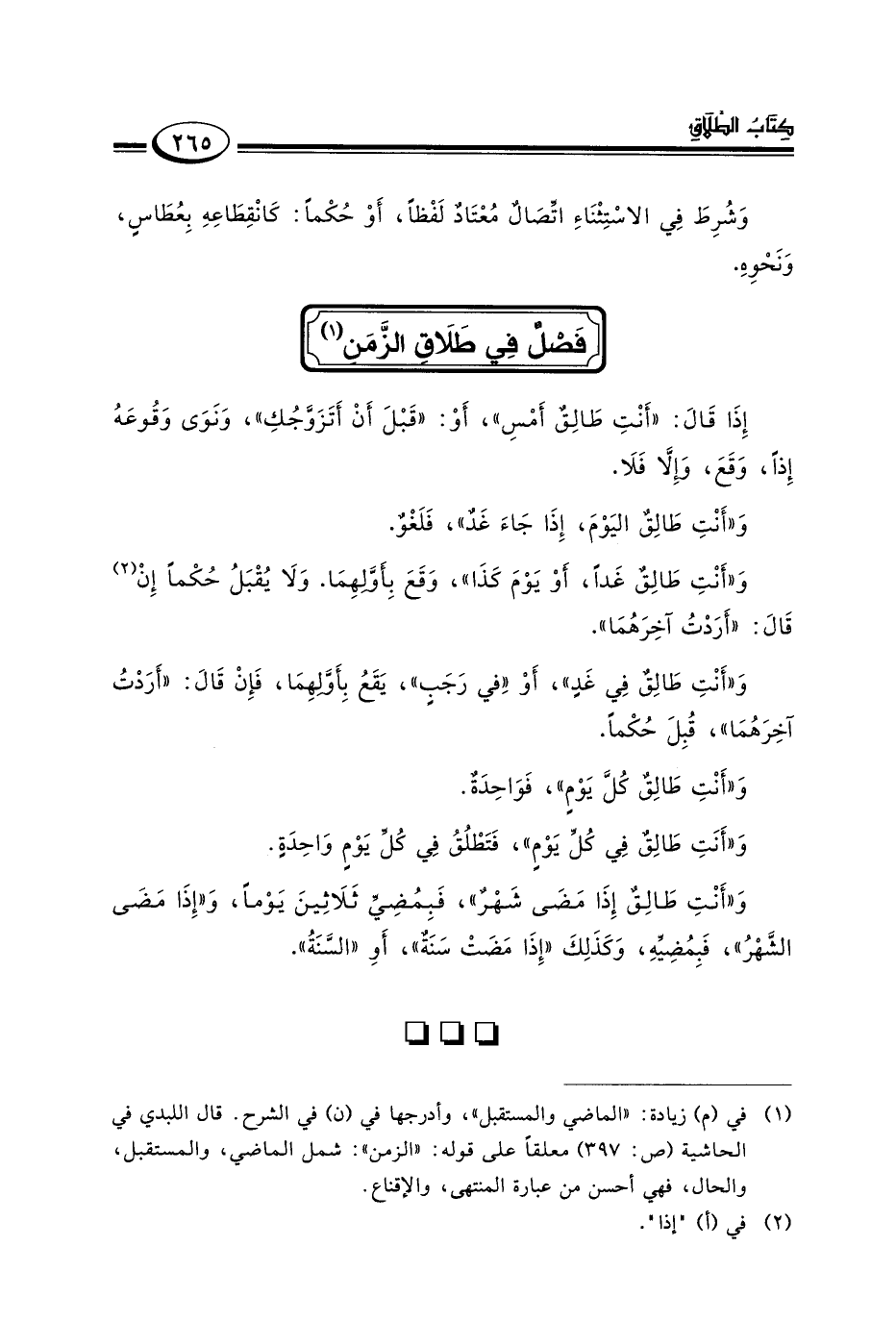 ١ في "م" زيادة: "الماضي والمستقبل" وأدرجها في "ن" في الشرح. قال اللبدي الحاشية "ص: ٣٩٧" معلقا على قوله: "الزمن": شمل الماضي والمستقل والحال فهي أحسن من عبارة المنتهى والإقناع.