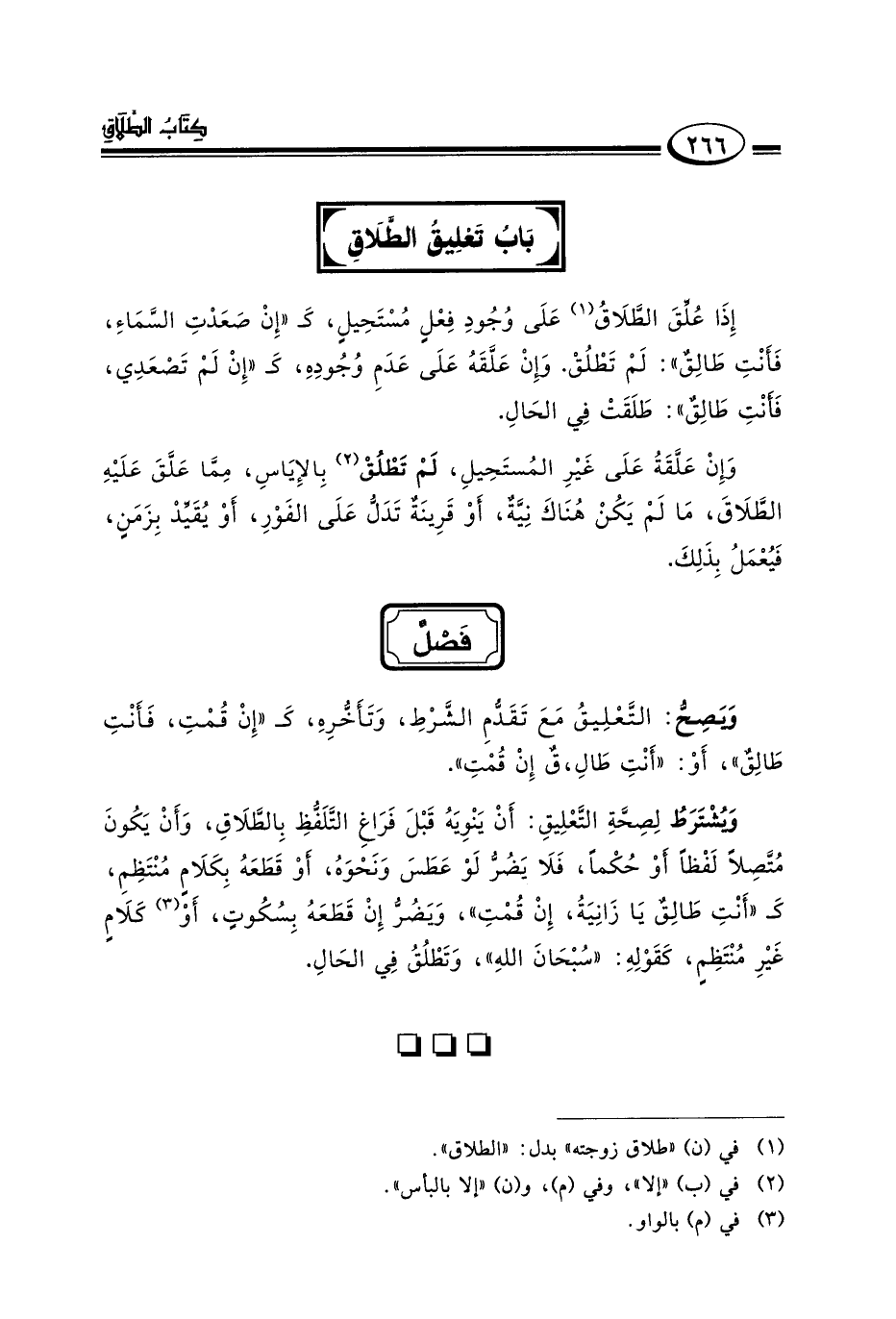 إذا علق الطلاق١ على وجود فعل مستحيل كـ"إن صعدت السماء فأنت طالق" لم تطلق وإن علقه على عدم وجوده كـ"إن لم تصعدي إلى السماء فأنت طالق" طلقت في الحال.