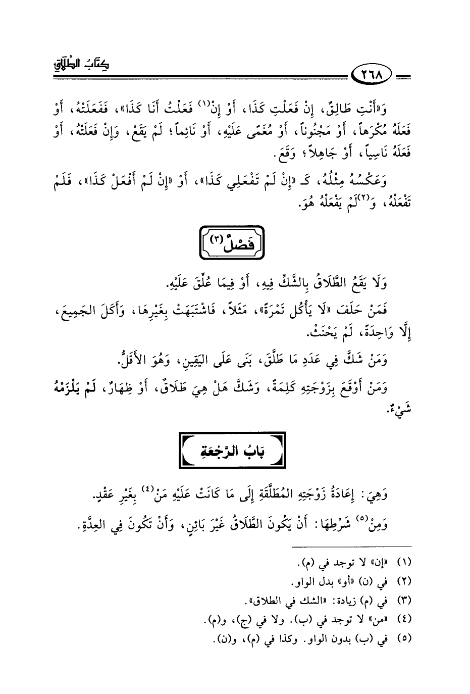 وأنت طالق إن فعلت كذا أو إن١ فعلت أنا كذا ففعلته أو فعله مكرها أو مجنونا أو مغمى عليه أو نائما لم يقع وإن فعلته أو فعله ناسيا أو جاهلا وقع.