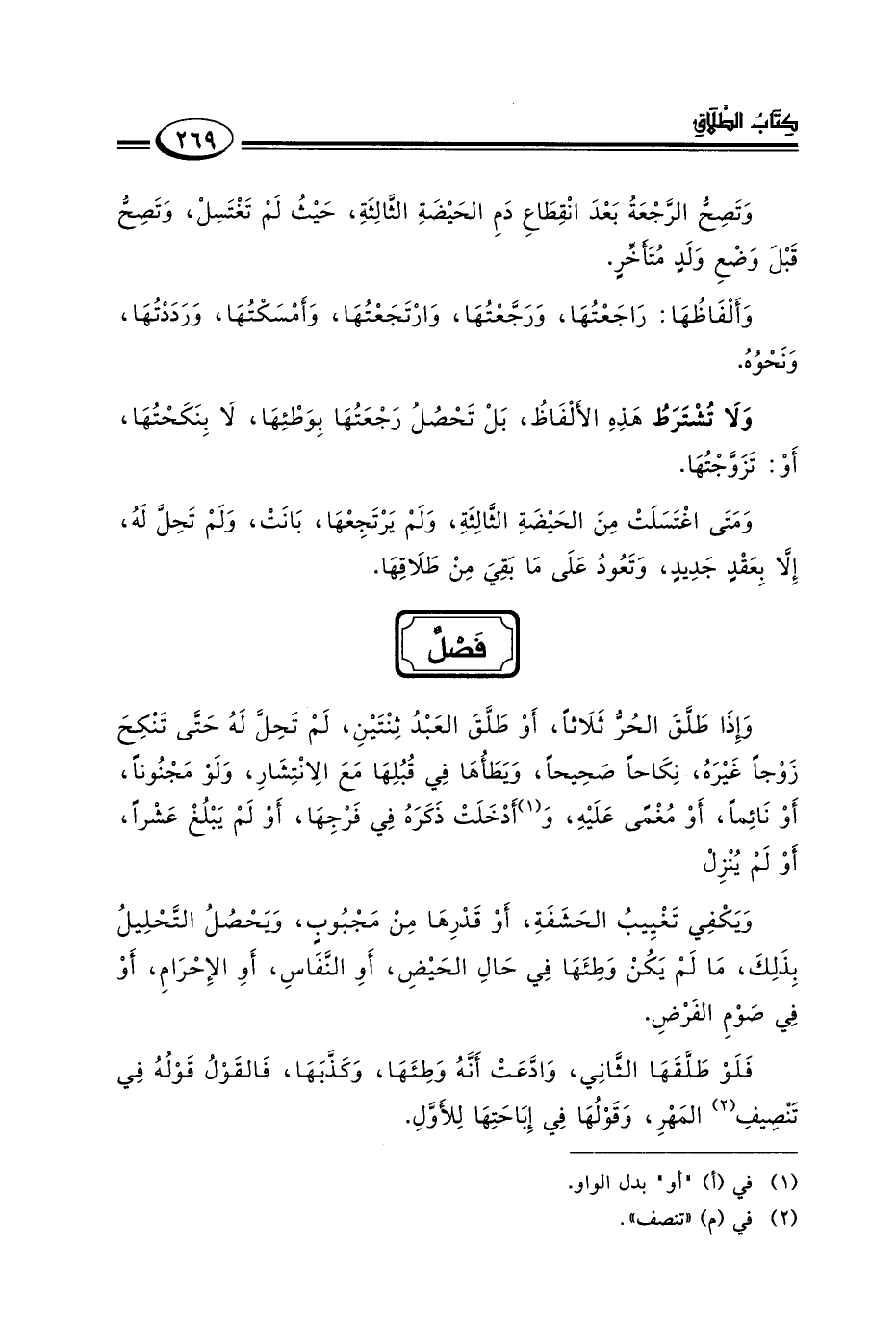 وإذا طلق الحر ثلاثا أو طلق العبد ثنتين لم تحل له حتى تنكح زوجا غيره نكاحا صحيحا ويطأها في قبلها مع الانتشار ولو مجنونا أو نائما أو مغمى عليه و١أدخلت ذكره في فرجها أو لم يبلغ عشرا أو لم ينزل.