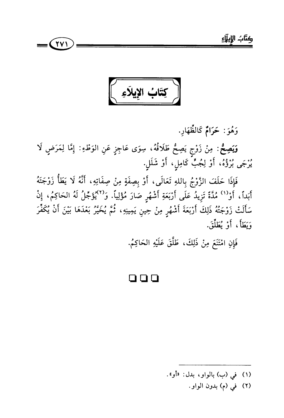 فإذا حلف الزوج بالله تعالى أو بصفة من صفاته أنه لا يطأ زوجته أبدا أو١ مدة تزيد على أربعة أشهر: صار مؤليا. و٢ يؤجل له الحاكم إن سألت زوجته ذلك أربعة أشهر من حين يمينه ثم يخير بعدها بين أن يكفر ويطأ أو يطلق.