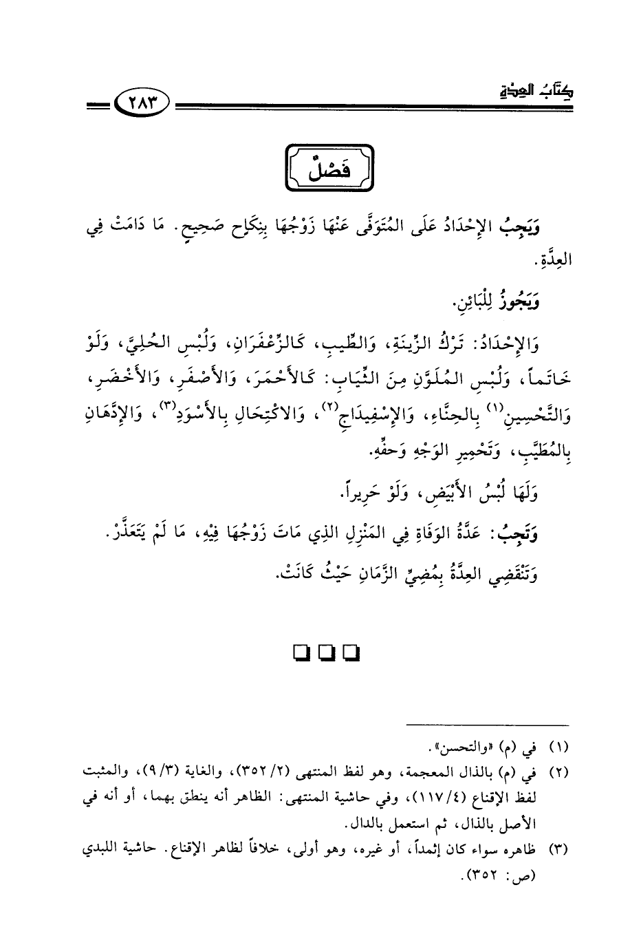 والإحداد: ترك الزينة والطيب كالزعفران ولبس الحلي ولو خاتما ولبس الملون من الثياب: كالأحمر والأصفر والأخضر والتحسين١ بالحناء والإسفيداج٢ والاكتحال بالأسود٣ والإدهان بالمطيب وتحمير الوجه وحفه.
