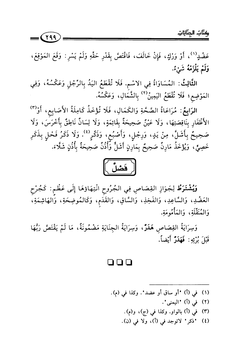 الرابع: مراعاة الصحة والكمال فلا يؤخذ كاملة الأصابع أو٣ الأظافر بناقصتها ولا عين صحيحة بقائمة ولا لسان ناطق بأخرس ولا صحيح بأشل من يد ورجل وأصبع وذكر٤ ولا ذكر فحل بذكر خصي ويؤخذ بمارن صحيح بمارن أشل وأذن صحيحة بأذن شلاء.
