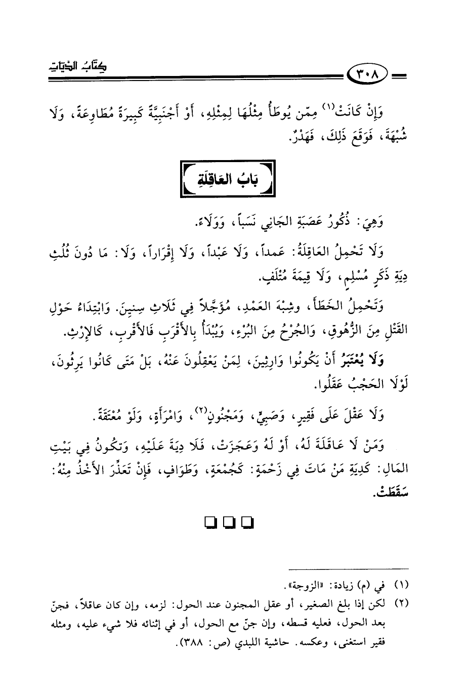 ولا عقل على فقير وصبي ومجنون٢ وامرأة ولو معتقة.