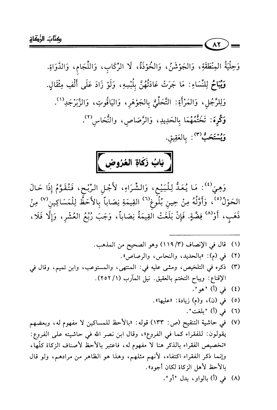 ٧ في حاشية التنقيح "ص: ١٣٣" قوله: "بالأحظ للمساكين لا مفهوم له وبعضهم يقولون: للفقراء كما في الفروع", وقال ابن نصر الله في حاشية على الفروع: "تخصيص الفقراء بالذكر هنا لا مفهوم له, فاعتبر بالأحظ لأصناف الزكاة كلها, وإنما ذكر الفقراء اكتفاء, لأنهم مثلهم, وهذا هو الظاهر من مرادهم, ولو قال بالأحظ لأهل الزكاة لكان أجود".