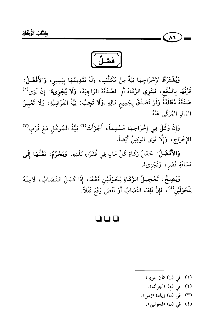 ويشترط لإخراجها نية من مكلف وله تقديمها بيسير والأفضل قرنها بالدفع فينوي الزكاة أو الصدقة الواجبة ولا يجزئ إن نوى١ صدقة مطلقة ولو تصدق بجميع ماله ولا تجب نية الفرضية ولا تعيين المال المزكي عنه.
