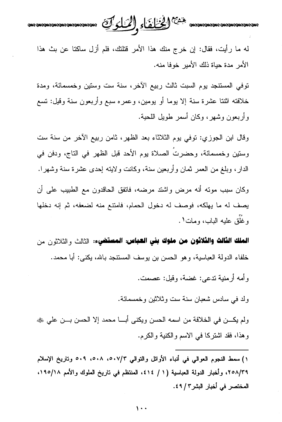 (¬1) سمط النجوم العوالي في أنباء الأوائل والتوالي 3/ 507، 508، 509 وتاريخ الإسلام 39/ 258، وأخبار الدولة العباسية (1/ 414، المنتظم في تاريخ الملوك والأمم 18/ 195، المختصر في أخبار البشر 3/ 49.