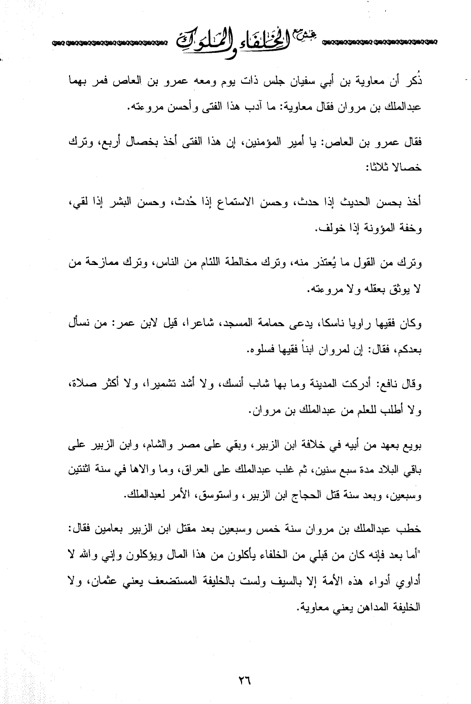 ذُكر أن معاوية بن أبي سفيان جلس ذات يوم ومعه عمرو بن العاص فمر بهما عبدالملك بن مروان فقال معاوية: ما آدب هذا الفتى وأحسن مروءته.
