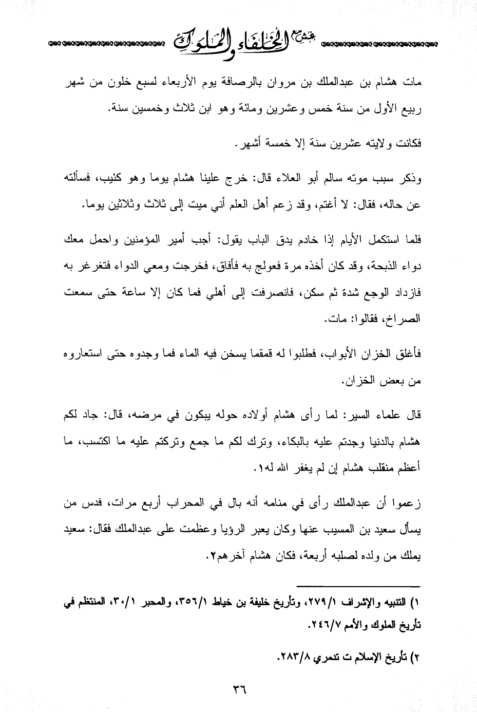 مات هشام بن عبدالملك بن مروان بالرصافة يوم الأربعاء لسبع خلون من شهر ربيع الأول من سنة خمس وعشرين ومائة وهو ابن ثلاث وخمسين سنة.