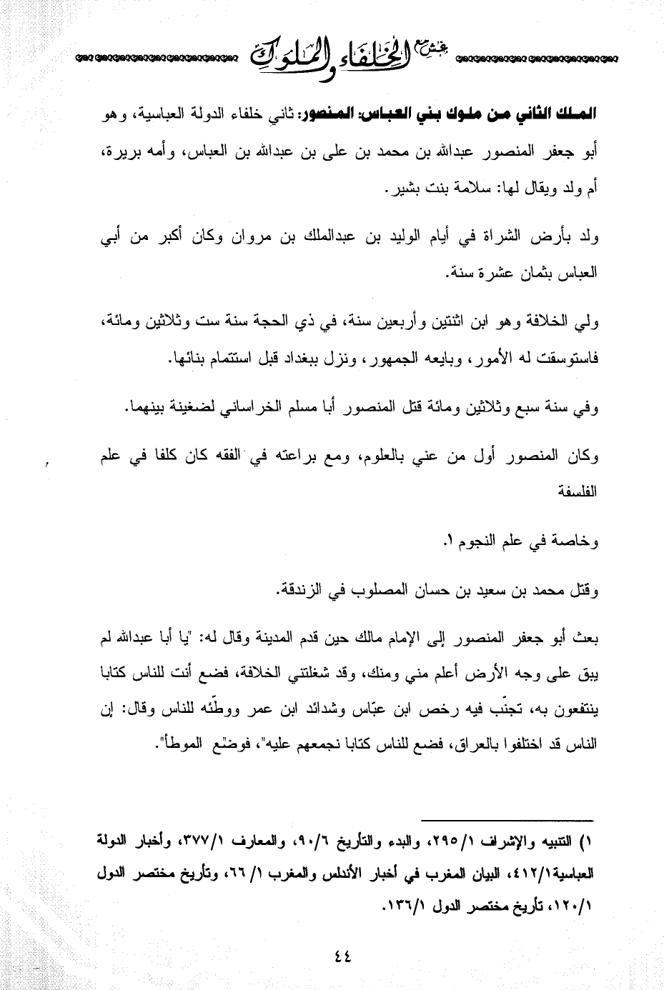 الملك الثاني من ملوك بني العباس: المنصور: ثاني خلفاء الدولة العباسية، وهو أبو جعفر المنصور عبدالله بن محمد بن على بن عبدالله بن العباس، وأمه بريرة، أم ولد ويقال لها: سلامة بنت بشير.