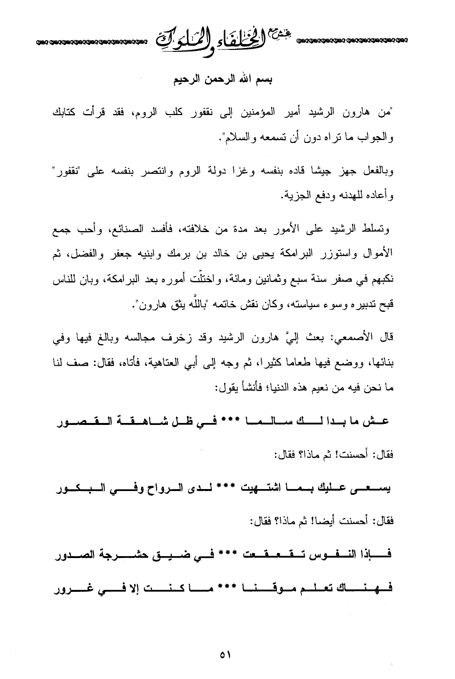 "من هارون الرشيد أمير المؤمنين إلى نقفور كلب الروم، فقد قرأت كتابك والجواب ما تراه دون أن تسمعه والسلام".