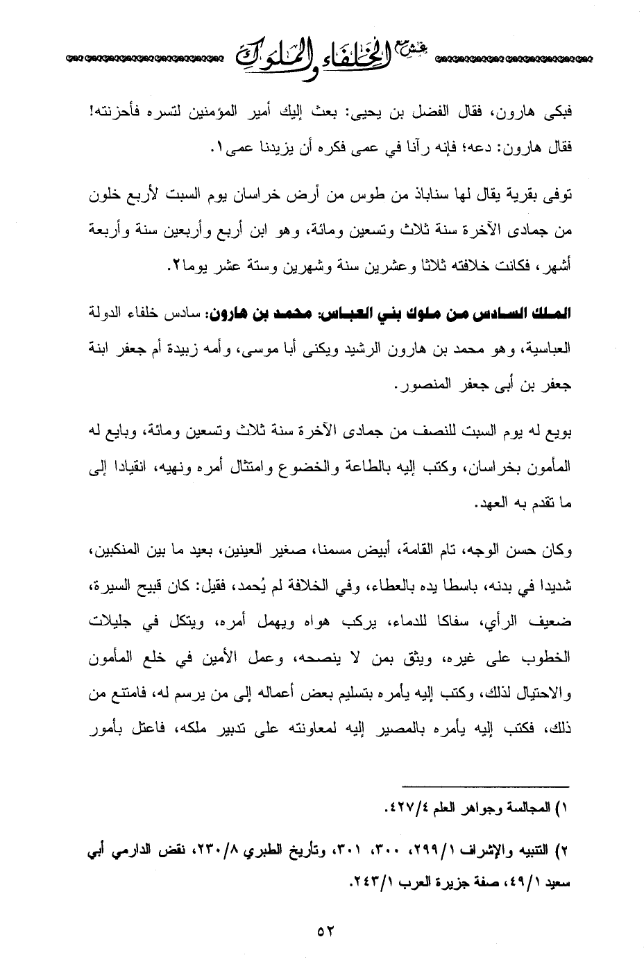 الملك السادس من ملوك بني العباس: محمد بن هارون: سادس خلفاء الدولة العباسية، وهو محمد بن هارون الرشيد ويكنى أبا موسى، وأمه زبيدة أم جعفر ابنة جعفر بن أبى جعفر المنصور.