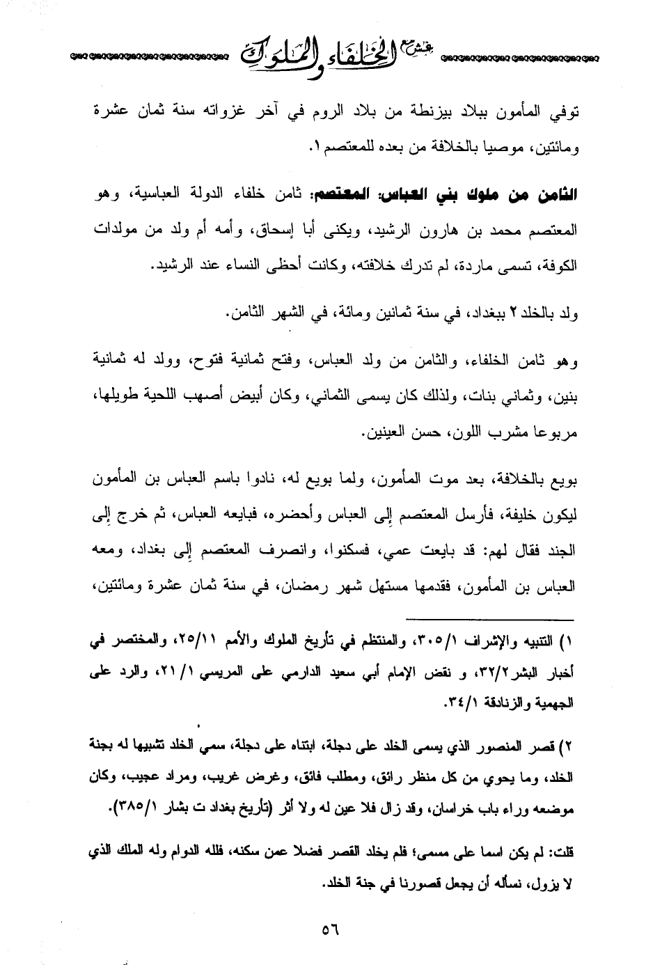 الثامن من ملوك بني العباس: المعتصم: ثامن خلفاء الدولة العباسية، وهو المعتصم محمد بن هارون الرشيد، ويكنى أبا إسحاق، وأمه أم ولد من مولدات الكوفة، تسمى ماردة، لم تدرك خلافته، وكانت أحظى النساء عند الرشيد.
