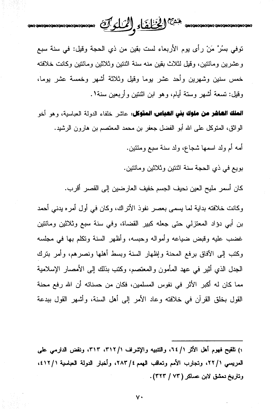 (¬1) تلقيح فهوم أهل الأثر 1/ 64، والتنبيه والإشراف 1/ 312، 313، ونقض الدارمي على المريسي 1/ 22، وتجارب الأمم وتعاقب الهمم 4/ 283، وأخبار الدولة العباسية 1/ 412، وتاريخ دمشق لابن عساكر (73/ 323.