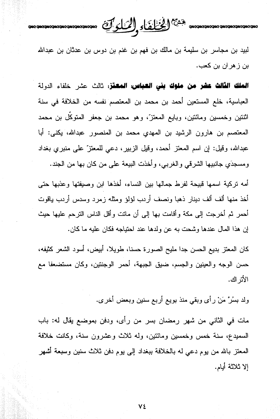 الملك الثالث عشر من ملوك بني العباس: المعتز: ثالث عشر خلفاء الدولة العباسية، خلع المستعين أحمد بن محمد بن المعتصم نفسه من الخلافة في سنة اثنتين وخمسين ومائتين، وبايع المعتزّ، وهو محمد بن جعفر المتوكّل بن محمد المعتصم بن هارون الرشيد بن المهدي محمد بن المنصور عبدالله، يكنى: أبا عبدالله، وقيل: إن اسم المعتز أحمد، وقيل الزبير، دعي للمعتزّ على منبري بغداد ومسجدَي جانبيها الشرقي والغربي، وأخذت البيعة على من كان بها من الجند.