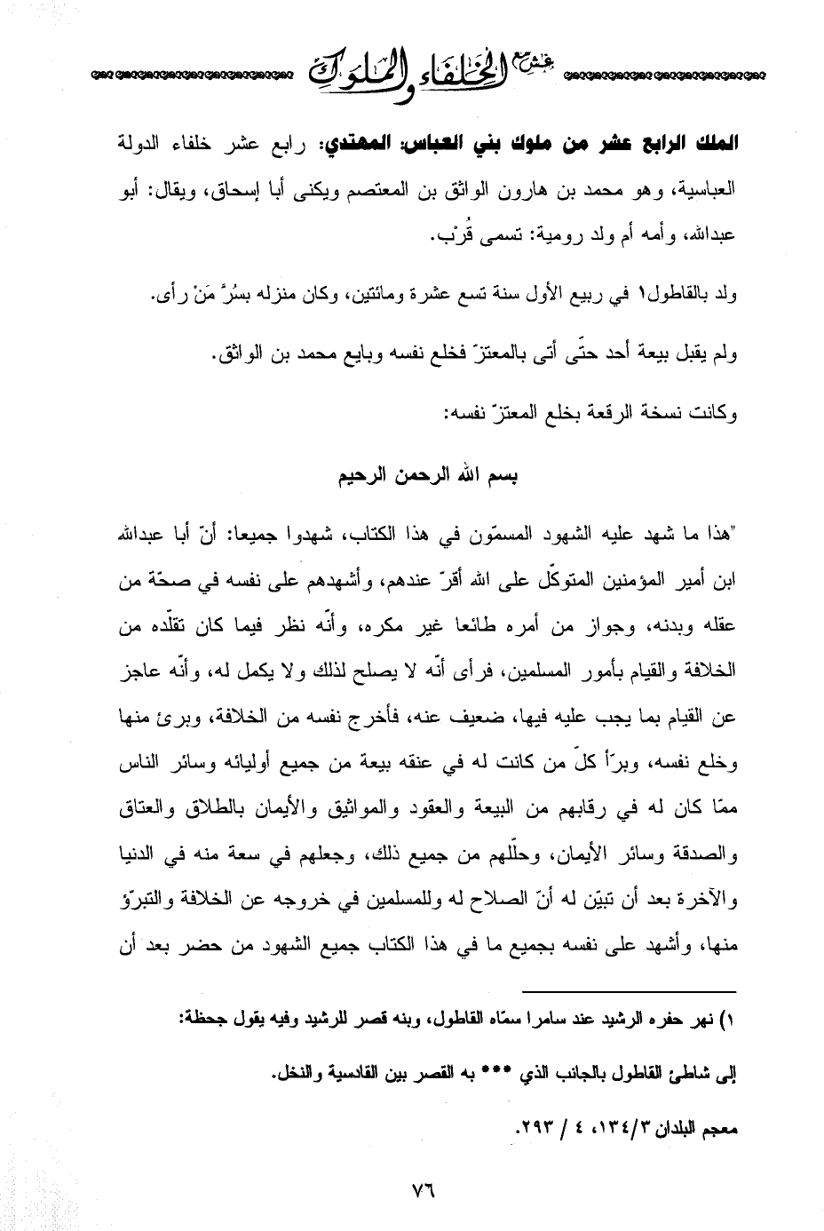 "هذا ما شهد عليه الشهود المسمّون في هذا الكتاب، شهدوا جميعا: أنّ أبا عبدالله ابن أمير المؤمنين المتوكّل على الله أقرّ عندهم، وأشهدهم على نفسه في صحّة من عقله وبدنه، وجواز من أمره طائعا غير مكره، وأنّه نظر فيما كان تقلّده من الخلافة والقيام بأمور المسلمين، فرأى أنّه لا يصلح لذلك ولا يكمل له، وأنّه عاجز عن القيام بما يجب عليه فيها، ضعيف عنه، فأخرج نفسه من الخلافة، وبرئ منها وخلع نفسه، وبرّأ كلّ من كانت له في عنقه بيعة من جميع أوليائه وسائر الناس ممّا كان له في رقابهم من البيعة والعقود والمواثيق والأيمان بالطلاق والعتاق والصدقة وسائر الأيمان، وحلّلهم من جميع ذلك، وجعلهم في سعة منه في الدنيا والآخرة بعد أن تبيّن له أنّ الصلاح له وللمسلمين في خروجه عن الخلافة والتبرّؤ منها، وأشهد على نفسه بجميع ما في هذا الكتاب جميع الشهود من حضر بعد أن