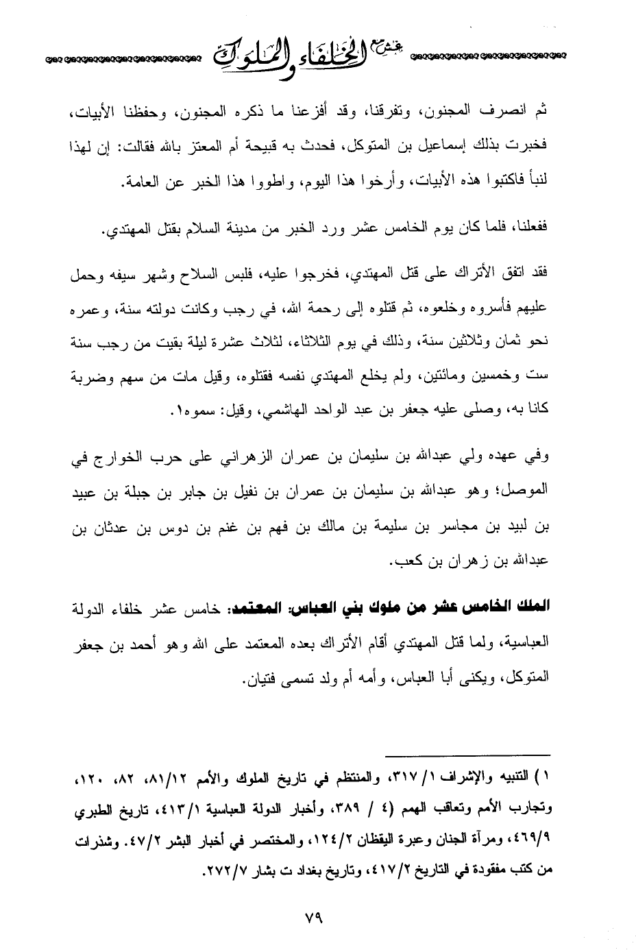 (¬1) التنبيه والإشراف 1/ 317، والمنتظم في تاريخ الملوك والأمم 12/ 81، 82، 120، وتجارب الأمم وتعاقب الهمم (4/ 389، وأخبار الدولة العباسية 1/ 413، تاريخ الطبري 9/ 469، ومرآة الجنان وعبرة اليقظان 2/ 124، والمختصر في أخبار البشر 2/ 47. وشذرات من كتب مفقودة في التاريخ 2/ 417، وتاريخ بغداد ت بشار 7/ 272.