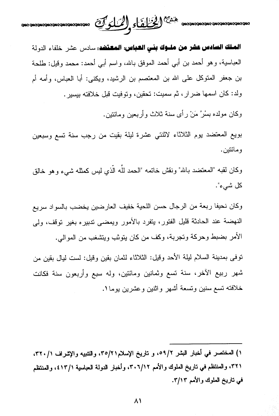 (¬1) المختصر في أخبار البشر 2/ 59، وتاريخ الإسلام 21/ 35، والتنبيه والإشراف 1/ 320، 321، والمنتظم في تاريخ الملوك والأمم 12/ 306، وأخبار الدولة العباسية 1/ 413، والمنتظم في تاريخ الملوك والأمم 13/ 3.
