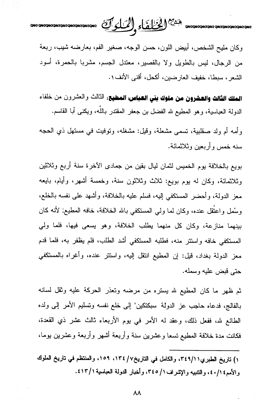 الملك الثالث والعشرون من ملوك بني العباس: المطيع: الثالث والعشرون من خلفاء الدولة العباسية، وهو المطيع لله الفضل بن جعفر المقتدر باللَّه، ويكنى أبا القاسم.