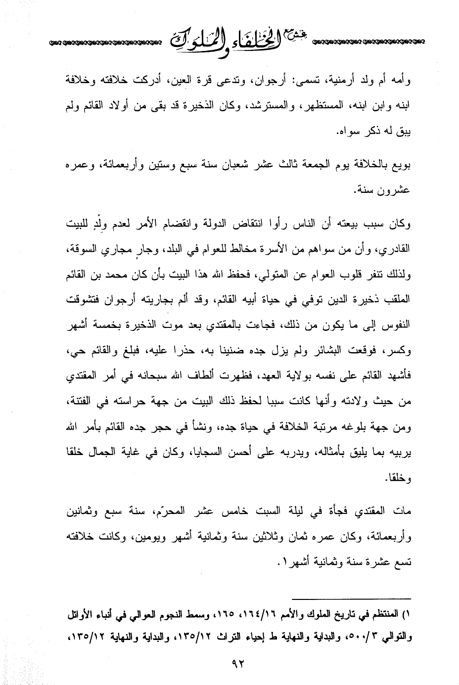 (¬1) المنتظم في تاريخ الملوك والأمم 16/ 164، 165، وسمط النجوم العوالي في أنباء الأوائل والتوالي 3/ 500، والبداية والنهاية ط إحياء التراث 12/ 135، والبداية والنهاية 12/ 135، والمختصر في أخبار البشر 2/ 191، والنجوم الزاهرة في ملوك مصر والقاهرة 5/ 140، وأخبار الدولة العباسية 1/ 413.