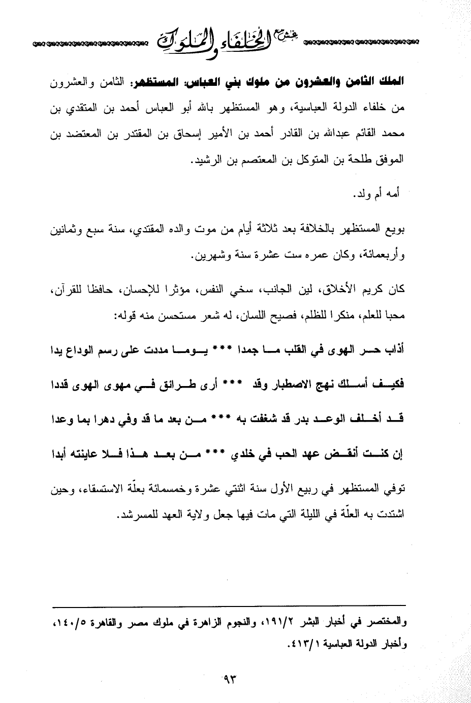 الملك الثامن والعشرون من ملوك بني العباس: المستظهر: الثامن والعشرون من خلفاء الدولة العباسية، وهو المستظهر بالله أبو العباس أحمد بن المتقدي بن محمد القائم عبدالله بن القادر أحمد بن الأمير إسحاق بن المقتدر بن المعتضد بن الموفق طلحة بن المتوكل بن المعتصم بن الرشيد.
