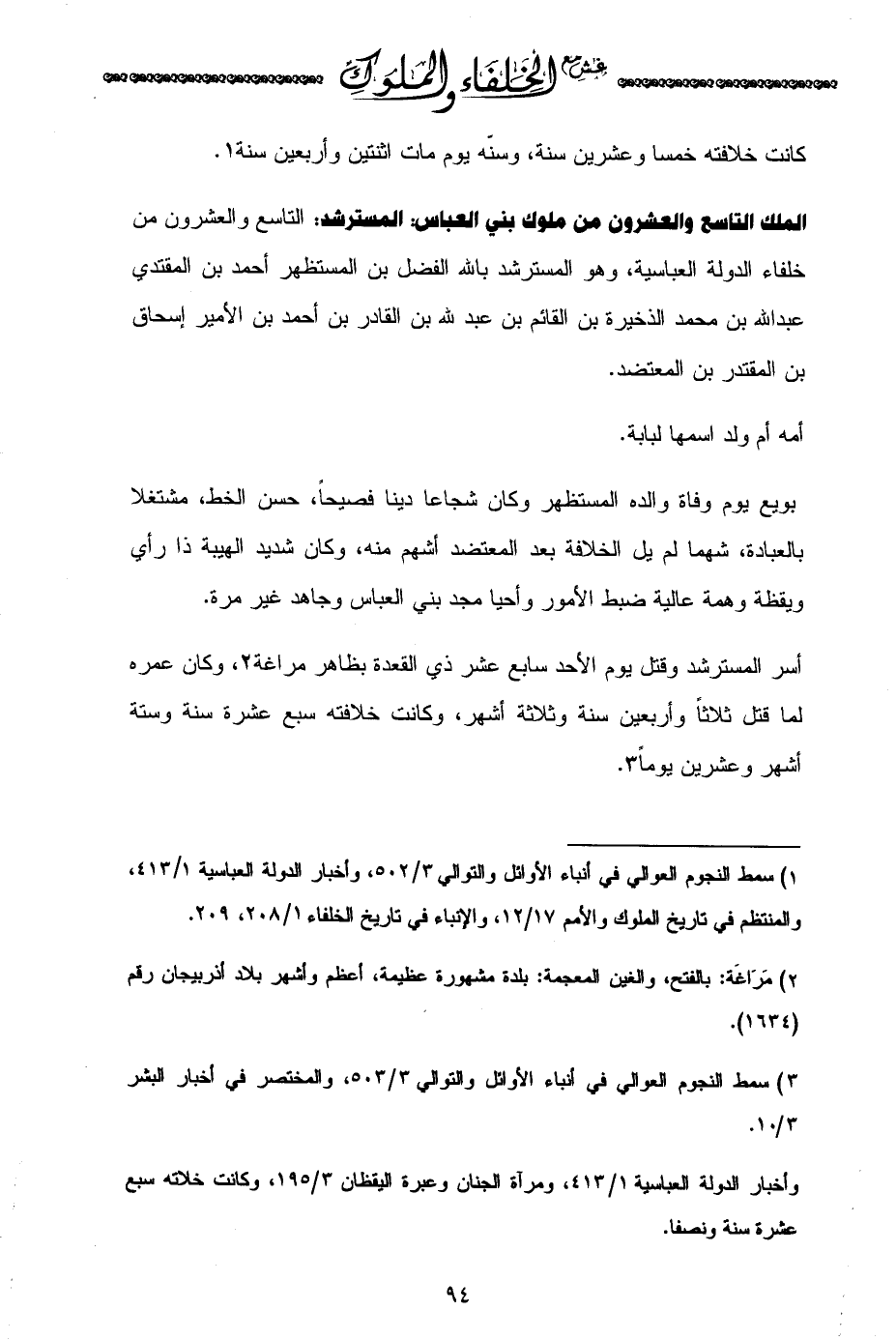 (¬1) سمط النجوم العوالي في أنباء الأوائل والتوالي 3/ 502، وأخبار الدولة العباسية 1/ 413، والمنتظم في تاريخ الملوك والأمم 17/ 12، والإنباء في تاريخ الخلفاء 1/ 208، 209.
