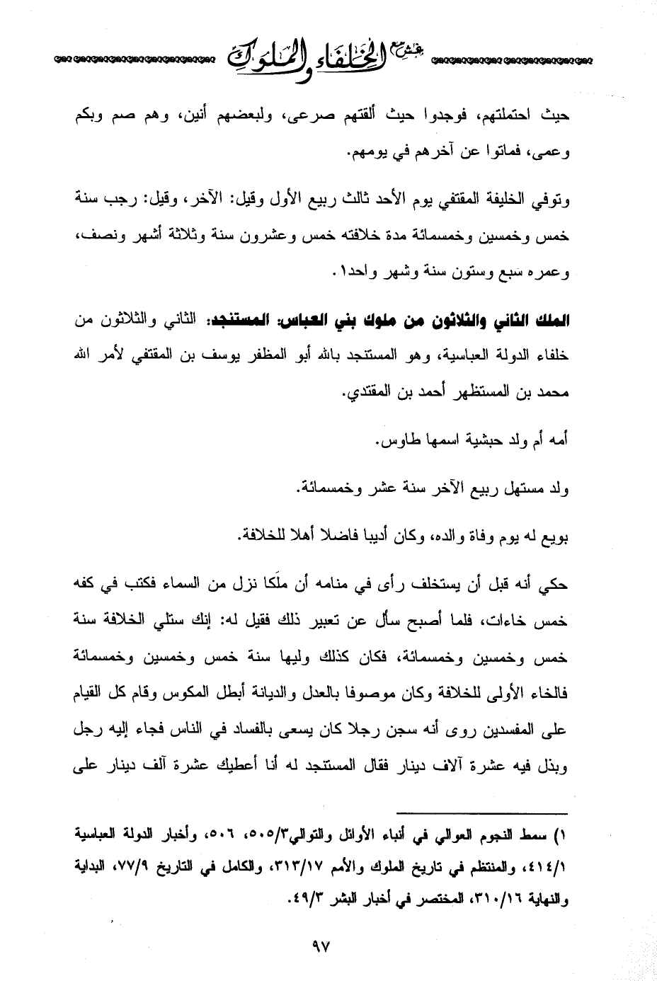 (¬1) سمط النجوم العوالي في أنباء الأوائل والتوالي 3/ 505، 506، وأخبار الدولة العباسية 1/ 414، والمنتظم في تاريخ الملوك والأمم 17/ 313، والكامل في التاريخ 9/ 77، البداية والنهاية 16/ 310، المختصر في أخبار البشر 3/ 49.