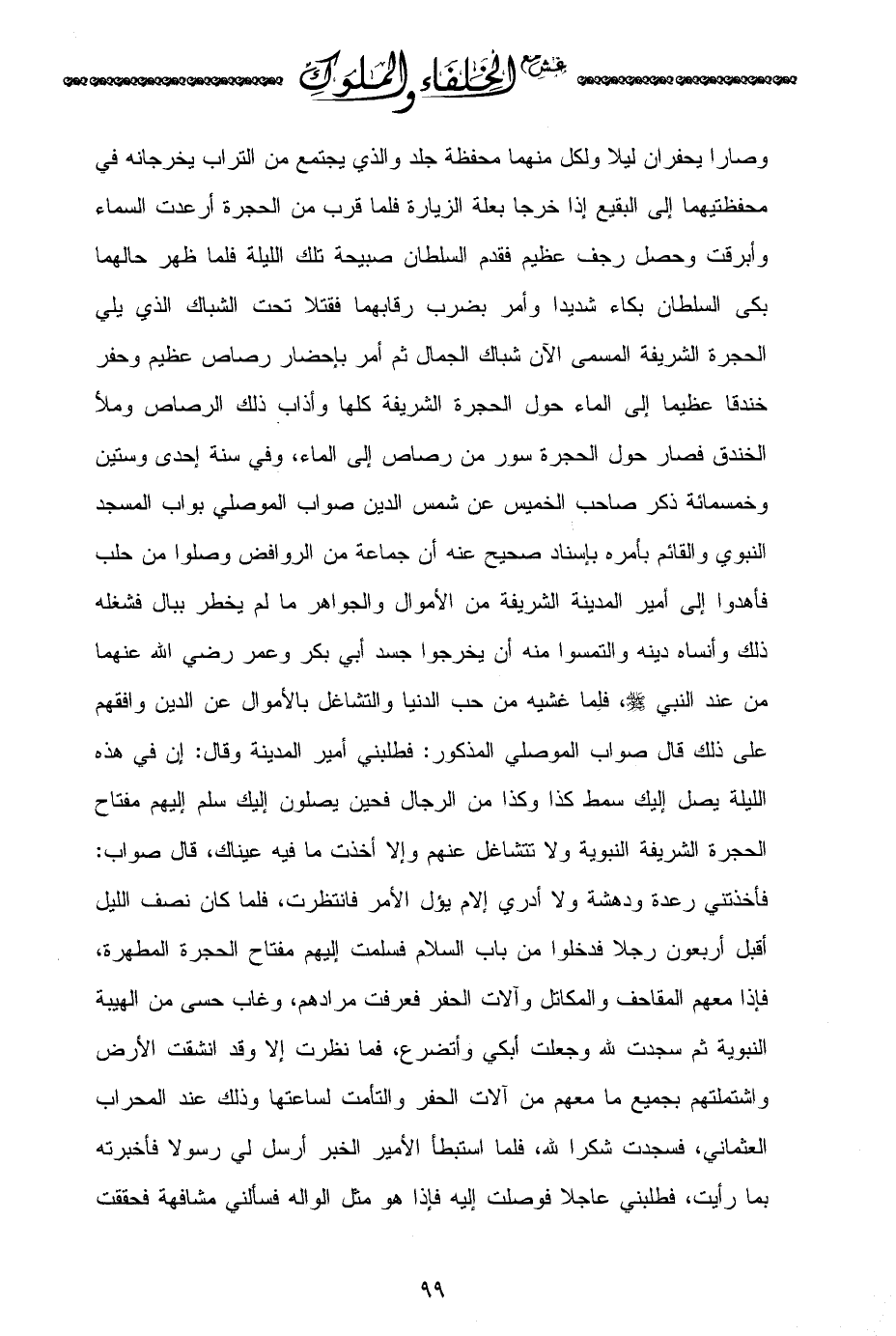 أن جماعة من الروافض وصلوا من حلب فأهدوا إلى أمير المدينة الشريفة من الأموال والجواهر ما لم يخطر ببال فشغله ذلك وأنساه دينه والتمسوا منه أن يخرجوا جسد أبي بكر وعمر رضي الله عنهما من عند النبي - صلى الله عليه وسلم -، فلِما غشيه من حب الدنيا والتشاغل بالأموال عن الدين وافقهم على ذلك قال صواب الموصلي المذكور: فطلبني أمير المدينة وقال: إن في هذه الليلة يصل إليك سمط كذا وكذا من الرجال فحين يصلون إليك سلم إليهم مفتاح الحجرة الشريفة النبوية ولا تتشاغل عنهم وإلا أخذت ما فيه عيناك، قال صواب: فأخذتني رعدة ودهشة ولا أدري إلام يؤل الأمر فانتظرت، فلما كان نصف الليل أقبل أربعون رجلا فدخلوا من باب السلام فسلمت إليهم مفتاح الحجرة المطهرة، فإذا معهم المقاحف والمكاتل وآلات الحفر فعرفت مرادهم، وغاب حسى من الهيبة النبوية ثم سجدت لله وجعلت أبكي وأتضرع، فما نظرت إلا وقد انشقت الأرض واشتملتهم بجميع ما معهم من آلات الحفر والتأمت لساعتها وذلك عند المحراب العثماني، فسجدت شكرا لله، فلما استبطأ الأمير الخبر أرسل لي رسولا فأخبرته بما رأيت، فطلبني عاجلا فوصلت إليه فإذا هو مثل الواله فسألني مشافهة فحققت