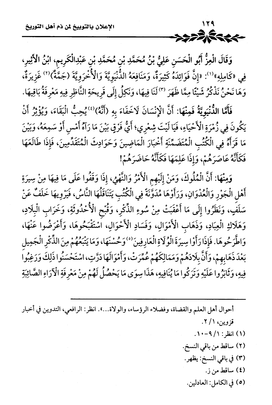 وَقَالَ الْعِزُّ أَبُو الْحَسَنِ عَلِيُّ بْنُ مُحَمَّدِ بْنِ مُحَمَّدِ بْنِ عَبْدِ الْكَرِيمِ، ابْنُ الأَثِيرِ، فِي "كَامِلِهِ" (¬١): "إِنَّ فَوَائِدَهُ كَثِيرَةٌ، وَمَنَافِعَهُ الدُّنْيَوِيَّةَ وَالْأُخْرَوِيَّةَ (جَمَّةٌ) (¬٢) غَزِيرَةٌ، وَهَا نَحْنُ نَذْكُرُ شَيْئًا مِمَّا ظَهَرَ (¬٣) لَنَا فِيهَا، وَنَكِلُ إِلَى قَرِيحَةِ النَّاظِرِ فِيهِ مَعْرِفَةُ بَاقِيهَا.