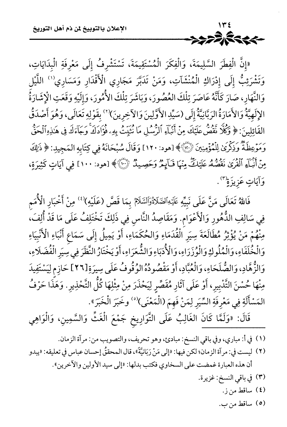 "إِنَّ الْفِطَرَ السَّلِيمَةَ، وَالْفِكَرَ الْمُسْتَقِيمَةَ، تَسْتَشْرِفُ إِلَى مَعْرِفَةِ الْبِدَايَاتِ، وَتَشْرَئِبُّ إِلَى إِدْرَاكِ الْمُنْشَآتِ، وَمَنْ تَدَبَّرَ مَجَارِي الْأَقْدَارِ وَمَسَارِي (¬١) اللَّيْل وَالنَّهَارِ، صَارَ كَأَنَّهُ عَاصَرَ تِلْكَ العُصُورَ، وَبَاشَرَ تِلْكَ الأُمُورَ، وَإِلَيْهِ وَقَعَتِ الْإِشَارَةُ الإِلَهِيَّةُ وَالأَمَارَةُ الرَبَّانِيَّةُ إِلَى (سَيِّدِ الأَوَّلِينَ وَالآخِرِينَ) (¬٢) بِقَوْلِهِ تَعَالَى، وَهُوَ أَصْدَقُ القَائِلِينَ: {وَكُلًّا نَقُصُّ عَلَيْكَ مِنْ أَنْبَاءِ الرُّسُلِ مَا نُثَبِّتُ بِهِ فُؤَادَكَ وَجَاءَكَ فِي هَذِهِ الْحَقُّ وَمَوْعِظَةٌ وَذِكْرَى لِلْمُؤْمِنِينَ (١٢٠)} [هود: ١٢٠] وَقَالَ سُبْحَانَهُ فِي كِتَابِهِ المَجِيدِ: {ذَلِكَ مِنْ أَنْبَاءِ الْقُرَى نَقُصُّهُ عَلَيْكَ مِنْهَا قَائِمٌ وَحَصِيدٌ (١٠٠)} [هود: ١٠٠] فِي آيَاتٍ كَثِيرَةٍ، وَآيَاتٍ عَزِيزَةٍ (¬٣).