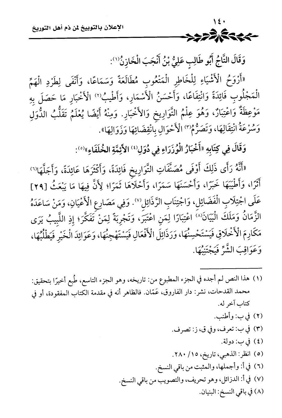 "أَرْوَحُ الْأَشْيَاءِ لِلْخَاطِرِ الْمَتْعُوبِ مُطَالَعَةً وَسَمَاعًا، وَأَنْفَى لِطَرْدِ الْهَمِّ الْمَجْلُوبِ فَائِدَةً وَانْتِفَاعًا، وَأَحْسَنُ الْأَسْمَارِ، وَأَطْيبُ (¬٢) الْأَخْبَارِ مَا حَصَلَ بِهِ مَوْعِظَةٌ وَاعْتِبَارٌ، وَهُوَ عِلْمُ التَّوَارِيخِ وَالأَخْبَارِ. وَمِنْهُ أَيْضًا يُعْلَمُ تَقَلُّبُ الدُّوَلِ وَسُرْعَةُ انْتِقَالِهَا، وَتَصَرُّمُ (¬٣) الْأَحْوَالِ بِانْقِضَائِهَا وَزَوَالِهَا".
