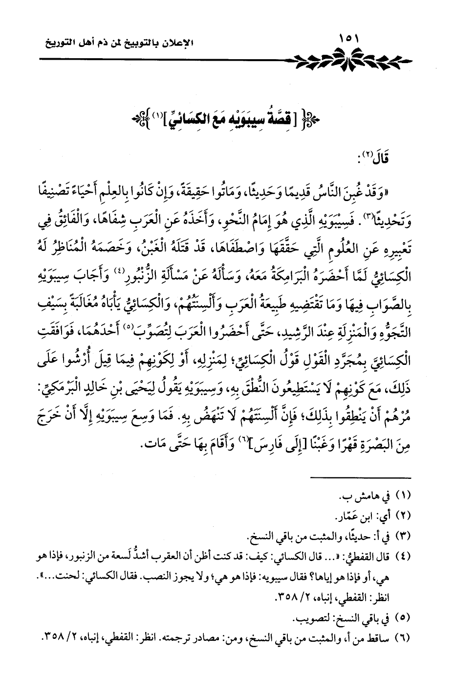 (¬٤) قال القفطيُّ: " .... قال الكسائي: كيف: قد كنت أظن أن العقرب أشدُّ لَسعة من الزنبور، فإذا هو هي، أو فإذا هو إياها؟ فقال سيبويه: فإذا هو هي؛ ولا يجوز النصب. فقال الكسائي: لحنت ... ". انظر: القفطي، إنباه، ٢/ ٣٥٨.