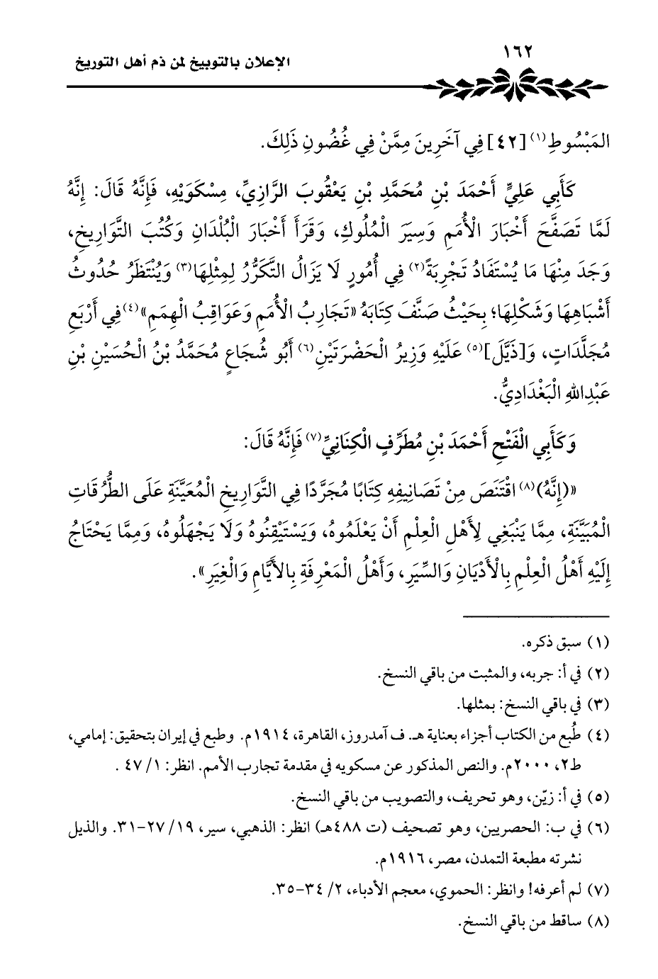 (¬٤) طُبع من الكتاب أجزاء بعناية هـ. ف آمدروز، القاهرة، ١٩١٤ م. وطبع في إيران بتحقيق: إمامي، ط ٢، ٢٠٠٠ م. والنص المذكور عن مسكويه في مقدمة تجارب الأمم. انظر: ١/ ٤٧.