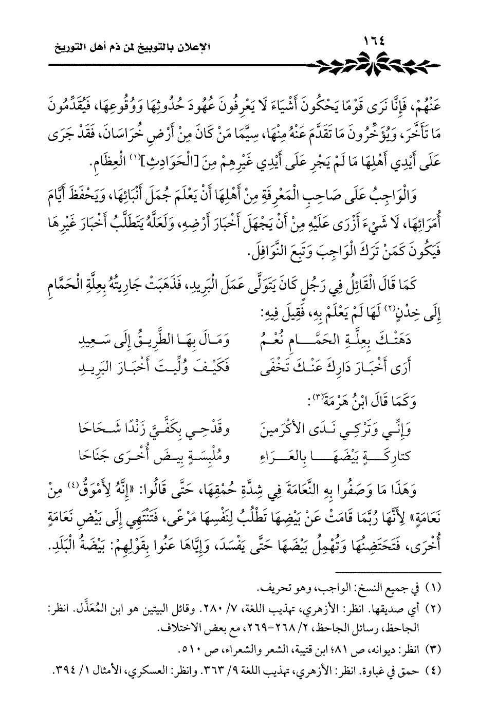وَالْوَاجِبُ عَلَى صَاحِبِ الْمَعْرِفَةِ مِنْ أَهْلِهَا أَنْ يَعْلَمَ جُمَلَ أَنْبَائِهَا، وَيَحْفَظَ أَيَّامَ أُمَرَائِهَا، لَا شَيْءَ أَزْرَى عَلَيْهِ مِنْ أَنْ يَجْهَلَ أَخْبَارَ أَرْضِهِ، وَلَعَلَّهُ يَتَطَلَّبُ أَخْبَارَ غَيْرِهَا فَيَكُونَ كَمَنْ تَرَكَ الْوَاجِبَ وَتَبِعَ النَّوَافِلَ.