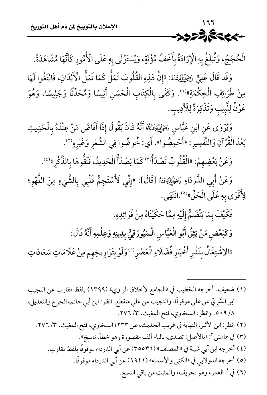 "الاِشْتِغَالُ بِنَشْرِ أَخْبَارِ فُضَلَاءِ الْعَصْرِ (¬٦) وَلَوْ بِتَوَارِيخِهِمْ مِنْ عَلَامَاتِ سَعَادَاتِ