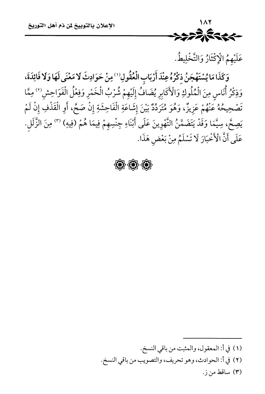 وَكَذَا مَا يُسْتَهْجَنُ ذِكْرُهُ عِنْدَ أَرْبَابِ الْعُقُولِ (¬١) مِنْ حَوَادِثَ لا مَعْنَى لَهَا وَلَا فَائِدَةَ، وَذِكْرُ أُنَاسٍ مِنَ الْمُلُوكِ وَالْأَكَابِرِ يُضَافُ إِلَيْهِمْ شُرْبُ الْخَمْرِ وَفِعْلُ الْفَوَاحِشِ (¬٢) مِمَّا تَصْحِيحُهُ عَنْهُمْ عَزِيزٌ، وَهُوَ مُتَرَدِّدٌ بَيْنَ إِشَاعَةِ الْفَاحِشَةِ إِنْ صَحَّ، أَوِ الْقَذْفِ إِنْ لَمْ يَصِحَّ، سِيَّمَا وَقَدْ يَتَضَمَّنُ التَّهْوِينَ عَلَى أَبْنَاءِ جِنْسِهِمْ فِيمَا هُمْ (فِيهِ) (¬٣) مِنَ الزَّلَلِ. عَلَى أَنَّ الْأَخْبَارَ لَا تَسْلَمُ مِنْ بَعْضِ هَذَا.