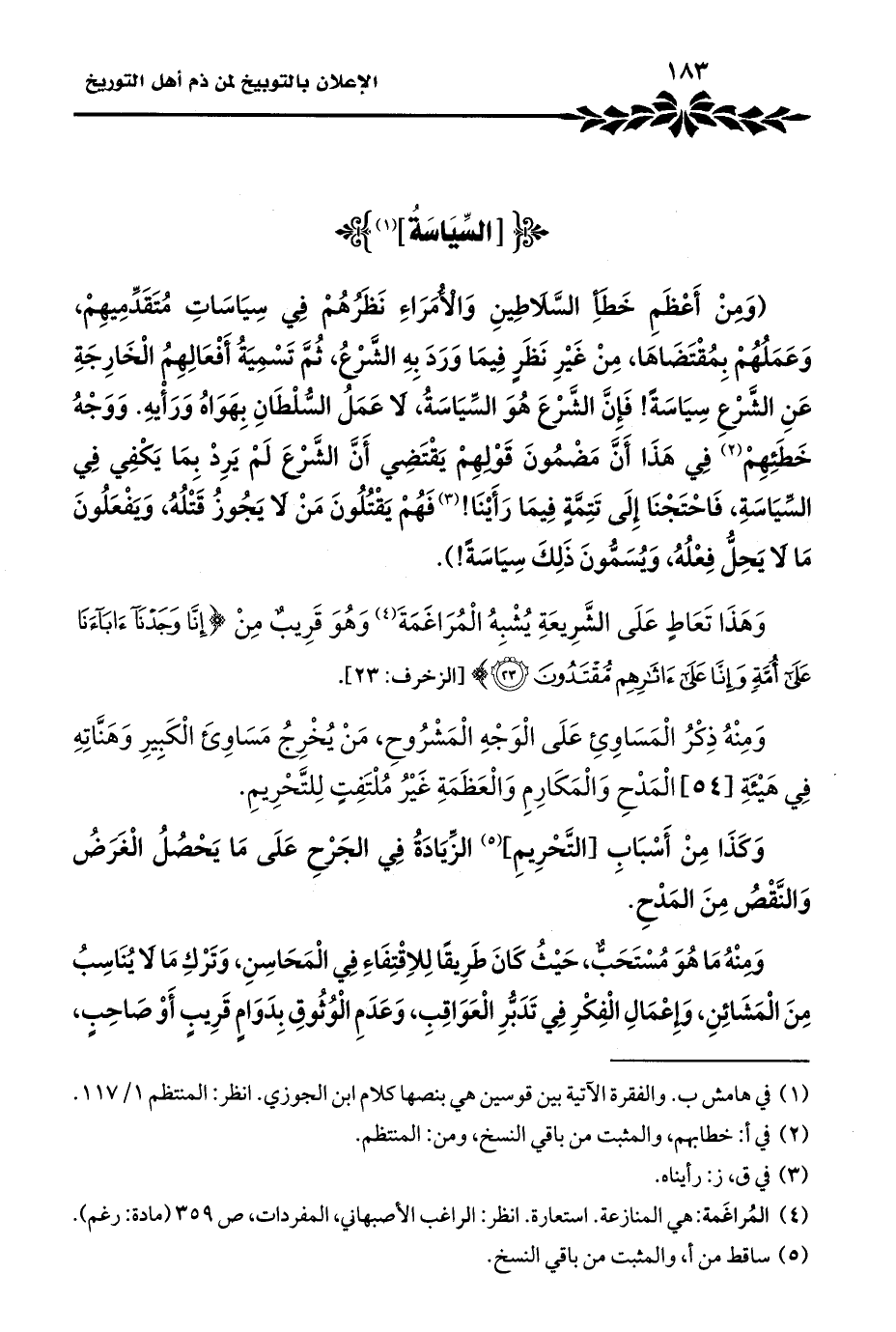 (وَمِنْ أَعْظَمِ خَطَأِ السَّلَاطِينِ وَالأُمَرَاءِ نَظَرُهُمْ فِي سِيَاسَاتِ مُتَقَدِّمِيهِمْ، وَعَمَلُهُمْ بِمُقْتَضَاهَا، مِنْ غَيْرِ نَظَرٍ فِيمَا وَرَدَ بِهِ الشَّرْعُ، ثُمَّ تَسْمِيَةُ أَفْعَالِهِمُ الْخَارِجَةِ عَنِ الشَّرْعِ سِيَاسَةً! فَإِنَّ الشَّرْعَ هُوَ السِّيَاسَةُ، لَا عَمَلُ السُّلْطَانِ بِهَوَاهُ وَرَأْيهِ. وَوَجْهُ خَطَئِهِمْ (¬٢) فِي هَذَا أَنَّ مَضْمُونَ قَوْلِهِمْ يَقْتَضِي أَنَّ الشَّرْعَ لَمْ يَرِدْ بِمَا يَكْفِي فِي السِّيَاسَةِ، فَاحْتَجْنَا إِلَى تَتِمَّةٍ فِيمَا رَأَيْنَا! (¬٣) فَهُمْ يَقْتُلُونَ مَنْ لَا يَجُوزُ قَتْلُهُ، وَيَفْعَلُونَ مَا لَا يَحِلُّ فِعْلُهُ، وَيُسَمُّونَ ذَلِكَ سِيَاسَةً! ).