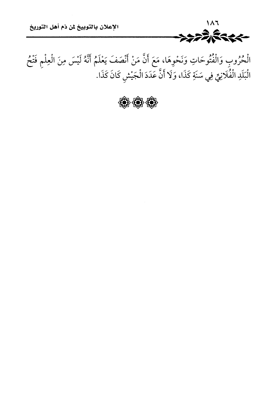 الْحُرُوبِ وَالْفُتُوحَاتِ وَنَحْوِهَا، مَعَ أَنَّ مَنْ أَنْصَفَ يَعْلَمُ أَنَّهُ لَيْسَ مِنَ الْعِلْمِ فَتْحُ الْبَلَدِ الْفُلَانِيِّ فِي سَنَةِ كَذَا، وَلَا أَنَّ عَدَدَ الْجَيْشِ كَانَ كَذَا.