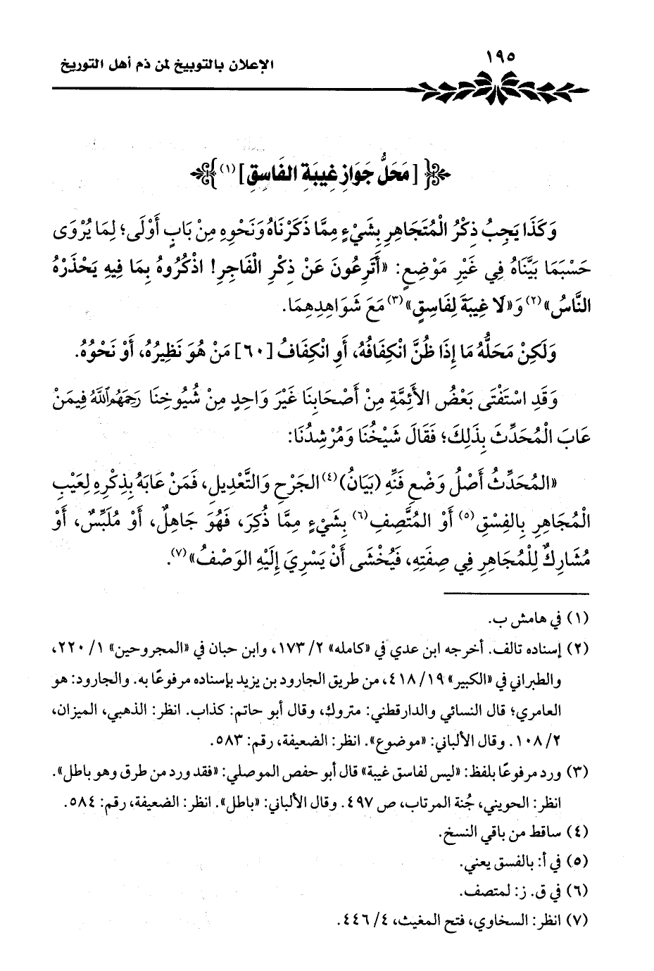 (¬٣) ورد مرفوعًا بلفظ: "ليس لفاسق غيبة" قال أبو حفص الموصلي: "فقد ورد من طرق وهو باطل". انظر الحويني، جُنة المرتاب، ص ٤٩٧. وقال الألباني: "باطل". انظر: الضعيفة، رقم: ٥٨٤.